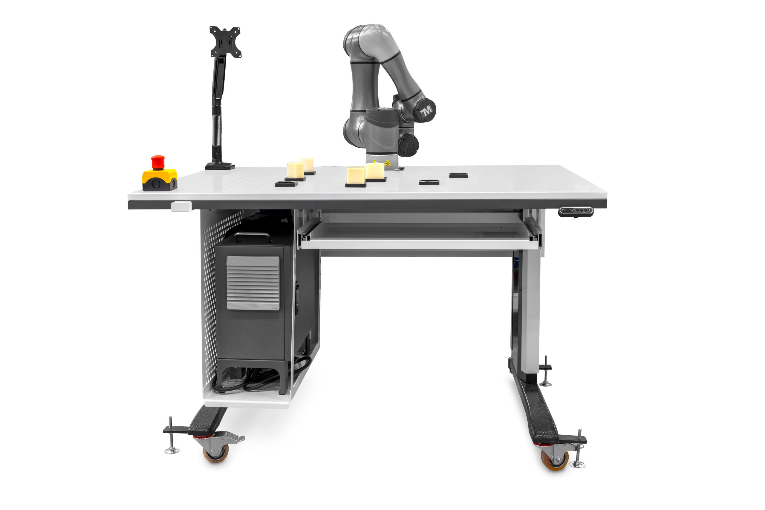 This comprehensive educational platform is specifically designed for teaching industrial robotics, vision systems, and AI automation alongside the TM7S cobot. Mounted on a height-adjustable steel frame with a mobile ESD base , the setup includes an AI Training Server for evaluating AI models. Complete with interactive 75-inch and 27-inch displays, it perfectly replicates a real-world collaborative robot environment for hands-on learning.
